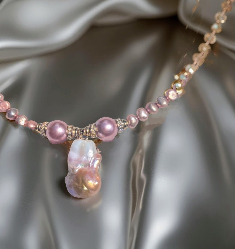 Artisan Ceramic Chunky Necklace. With shades of blue and tan, oval-shaped beads interspersed with star-shaped focals. Glossy with texture.