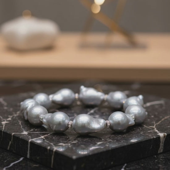 This chunky baroque pearl bracelet blends timeless elegance with artisanal charm. Luminous, organically shaped baroque pearls create a bold yet refined statement, while delicate silver daisy spacers add a touch of vintage romance and subtle sparkle. Each pearl’s natural shape makes this bracelet truly one of a kind, offering texture, depth, and effortless sophistication. Perfect for dressing up an evening look or adding elegance to everyday wear.