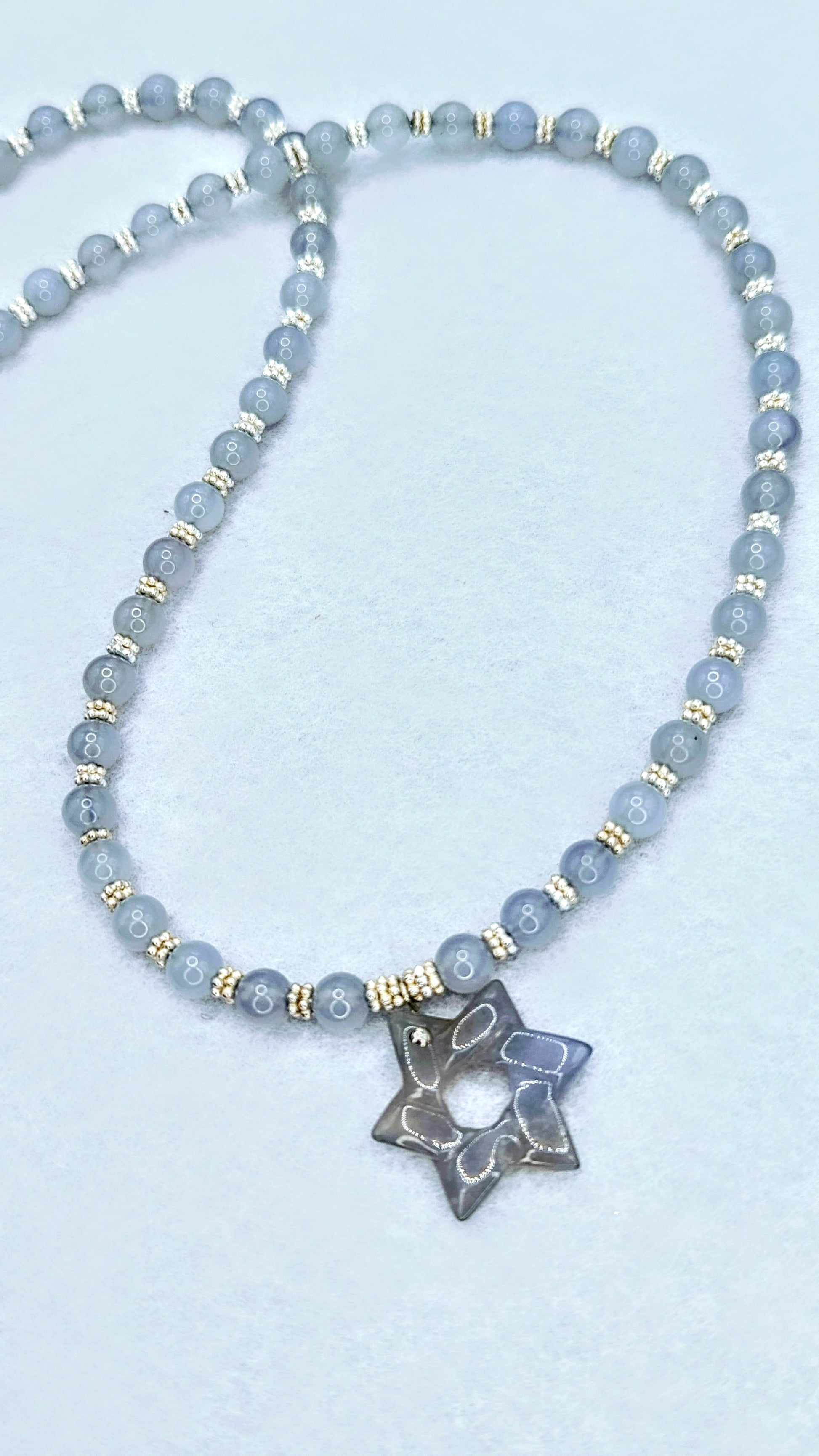 A stunning and unique Star of David necklace. Both the Beaded strand and the Star are made of Blue Calcedony. (Kal-seh-duh-nee) The Star shape is delicately carved, showcasing the stone's translucent qualities.